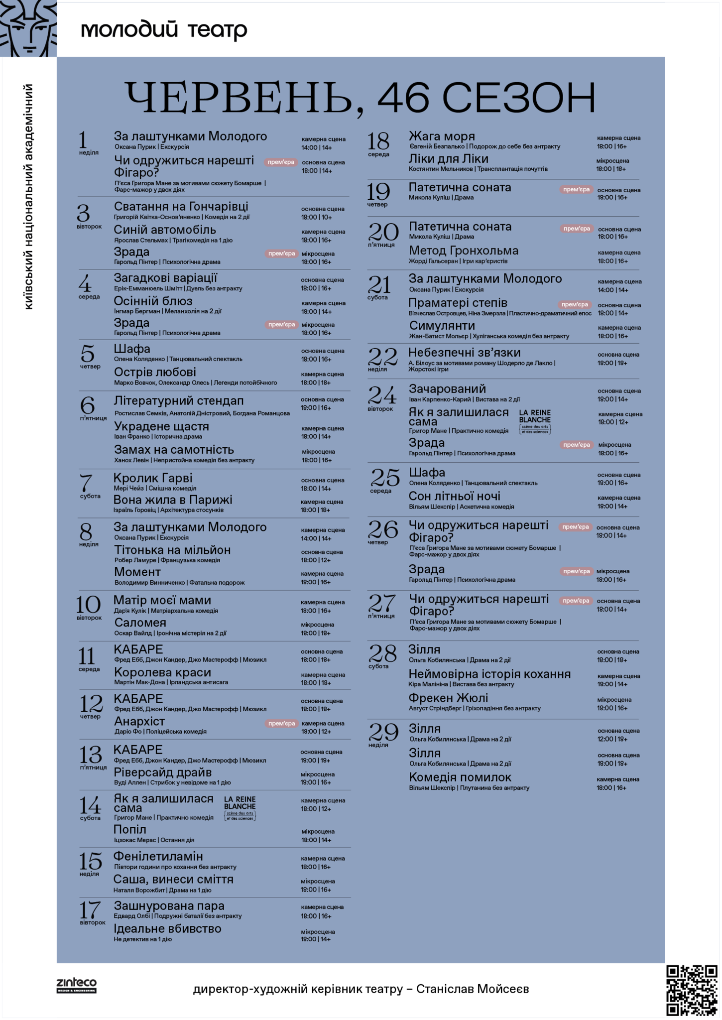 28 травня 2025 Завершуємо 46-ий тетральний сезон! Зустрічайте репертуар червня! Квитки — в касі та на сайті театру. Молодий — театр про кохання