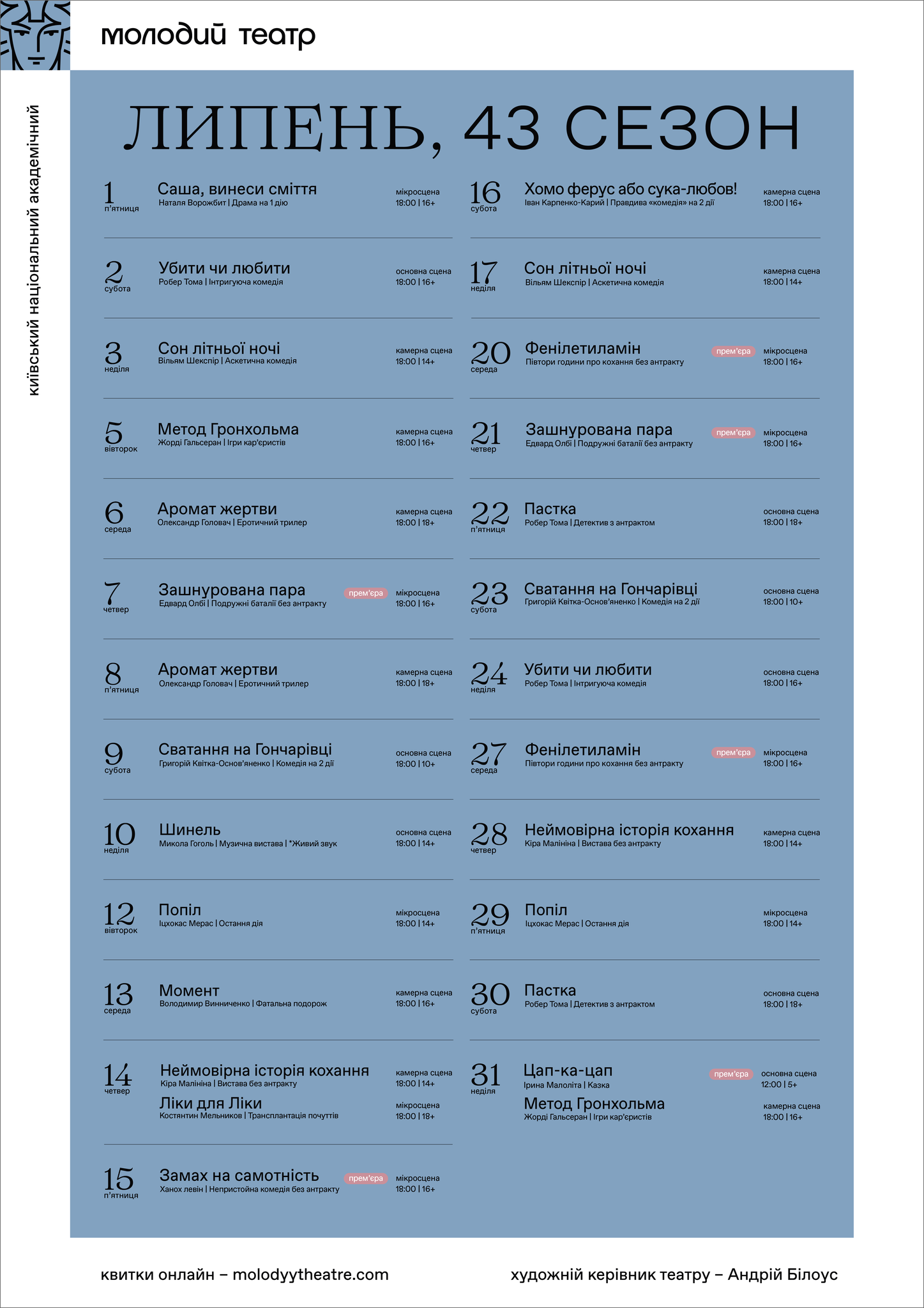 08 липня 2022 Зустрічаємо театральний липень! Пропонуємо до вашої уваги репертуар на липень і запрошуємо на вистави Молодого. Афіша липня