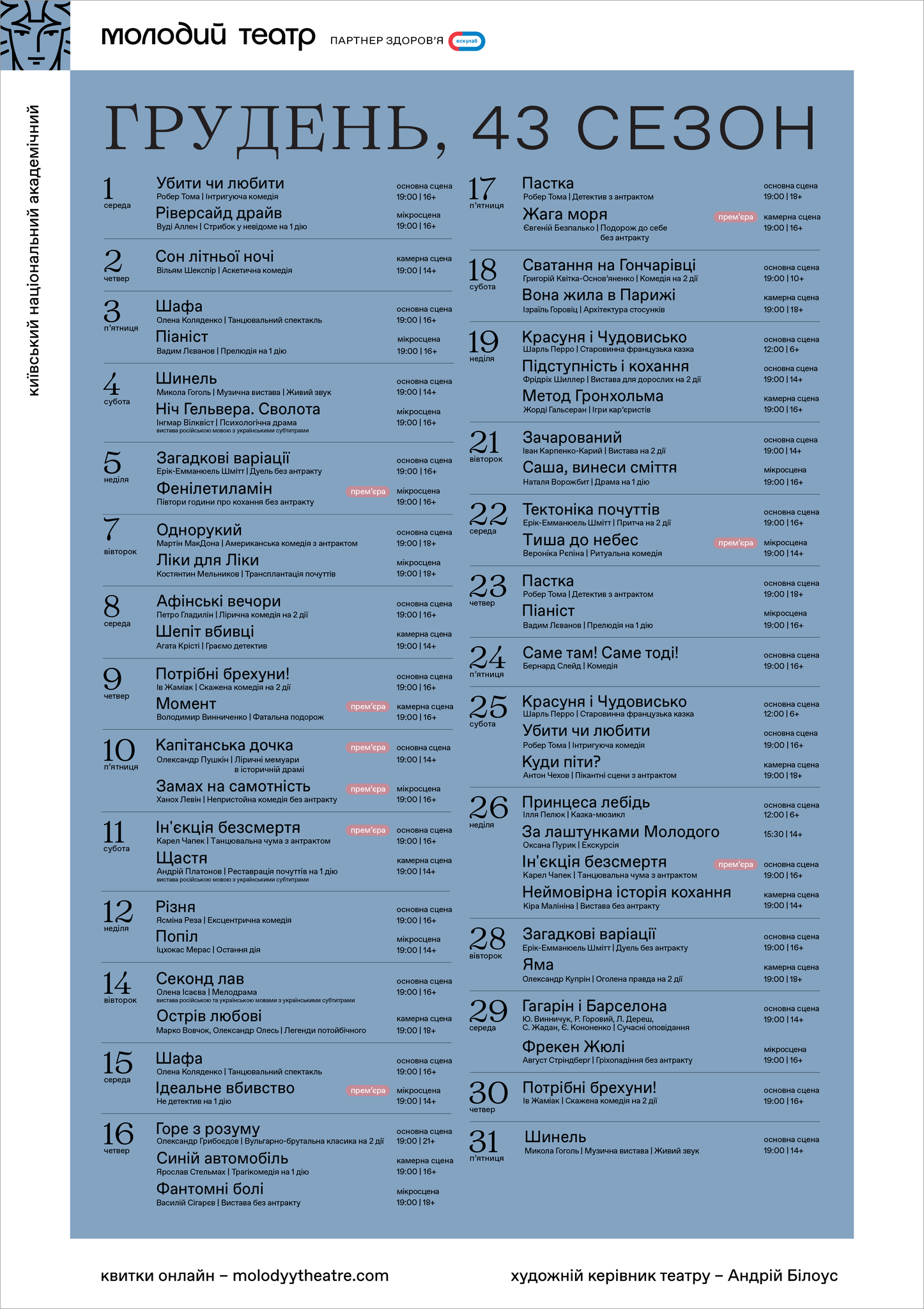 Пропонуємо до вашої уваги репертуар на грудень і запрошуємо на вистави Молодого!